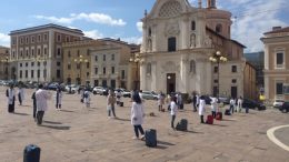 Covid 19 L’Aquila: in piazza Duomo monta la protesta di giovani medici, specializzandi e studenti che chiedono risorse per la sanità pubblica e più posti…