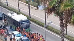 Costume, ghirlanda e bicchieri di plastica alla mano, i bagnanti improvvisano un “trenino” di Ferragosto coinvolgendo i passeggeri di un autobus pubblico, sul lungomare di…