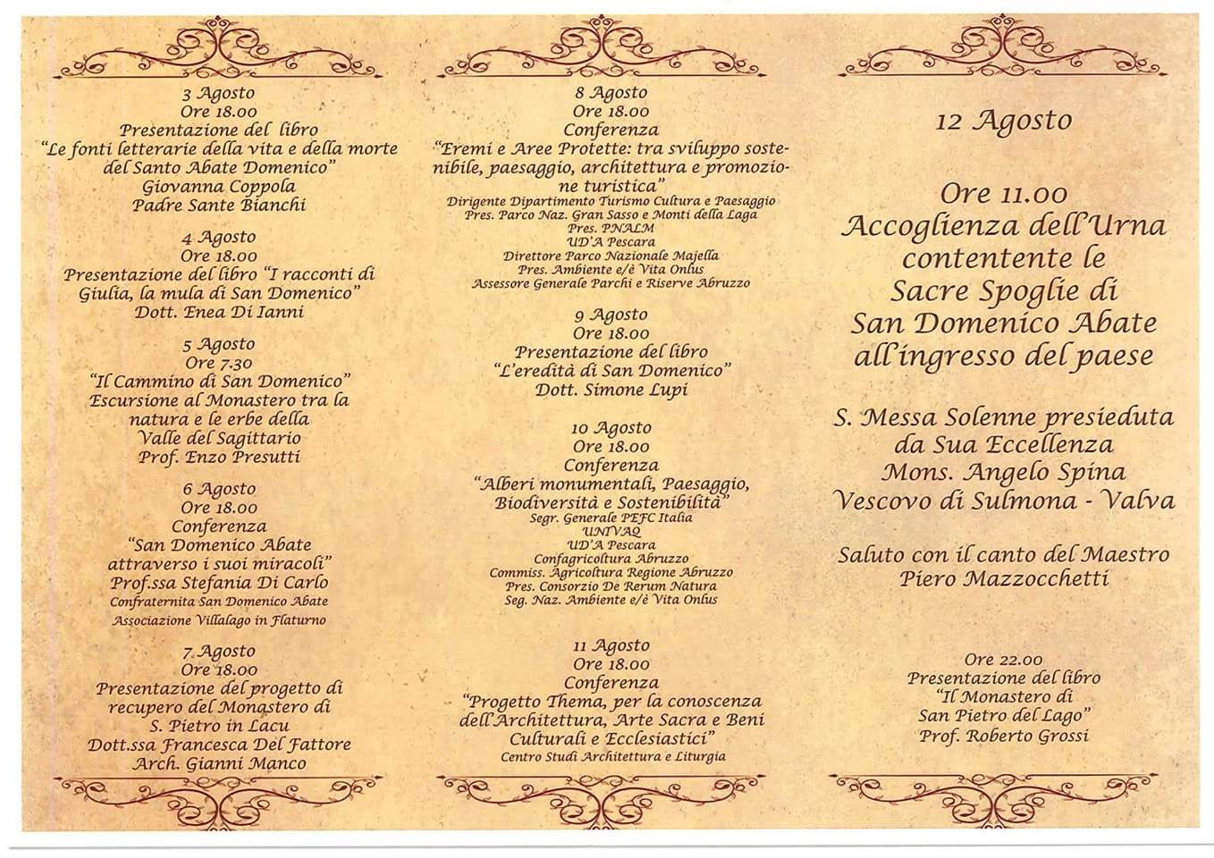 Un variegato programma di attività declinato in presentazioni di libri, seminari, approfondimenti tematici , visite guidate , escursioni e celebrazioni Religiose accompagnerà e farà da contorno al ritorno a Villalago , dopo circa 1000 anni, delle Spoglie di San Domenico Abate, che riposa presso l’Abbazia di San Domenico a Sora, nel periodo 12-16 Agosto.