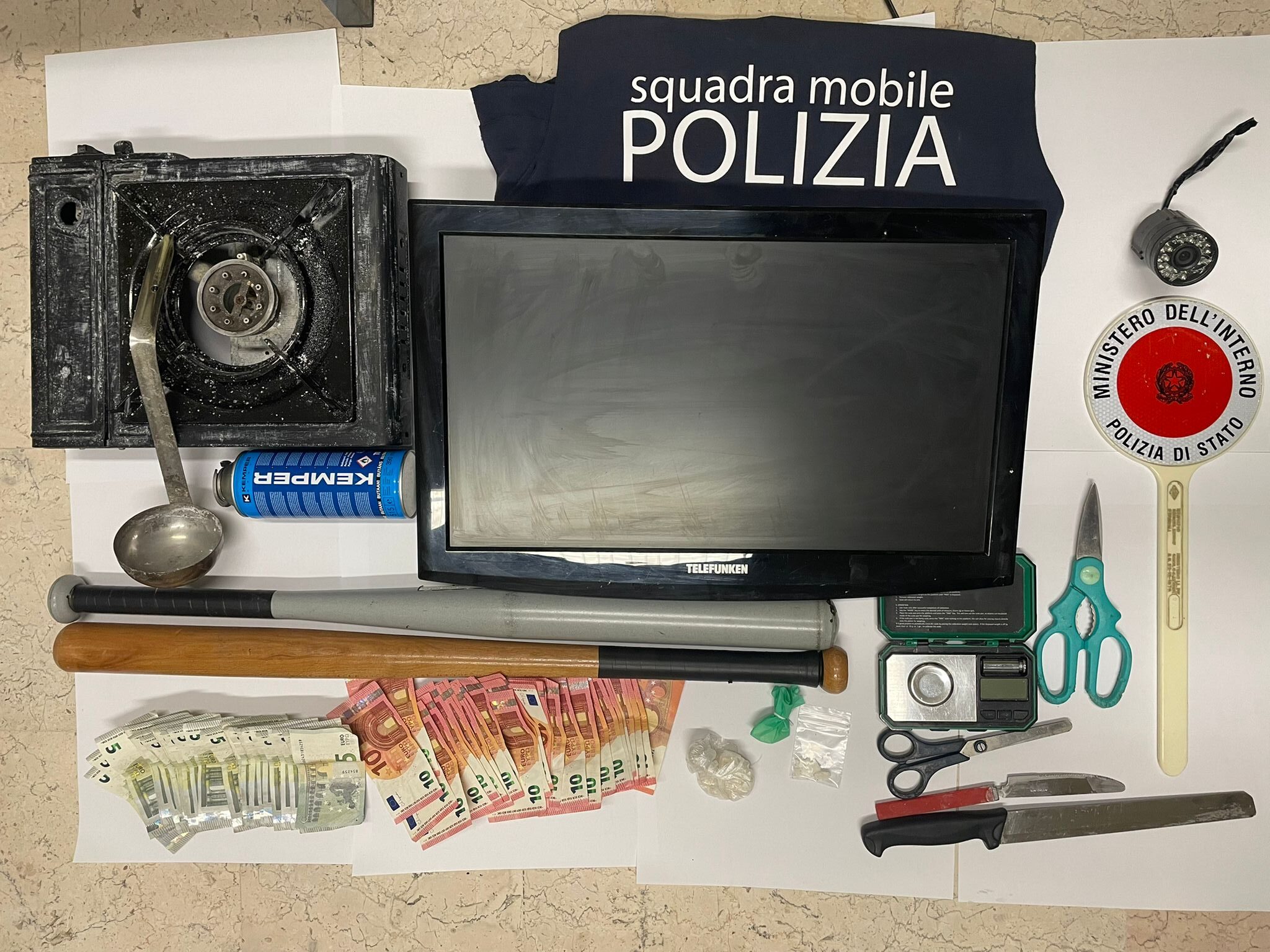 Complessivamente sono stati rinvenuti e sequestrati 30 grammi circa di crack, oltre alle sostanze utili per la preparazione dello stesso, un fornelletto da campo utilizzato per il procedimento di cottura e materiale per il confezionamento in dosi. Sottoposti inoltre a sequestro 470 euro in banconote da 5 e 10 euro, verosimilmente provento dello spaccio, essendo entrambi gli arrestati disoccupati. Sequestrate anche 2 mazze da baseball, trovate accanto alla porta d’ingresso, pronte per un eventuale utilizzo, nonché l’impianto di videosorveglianza installato per agevolare l’attività illecita.