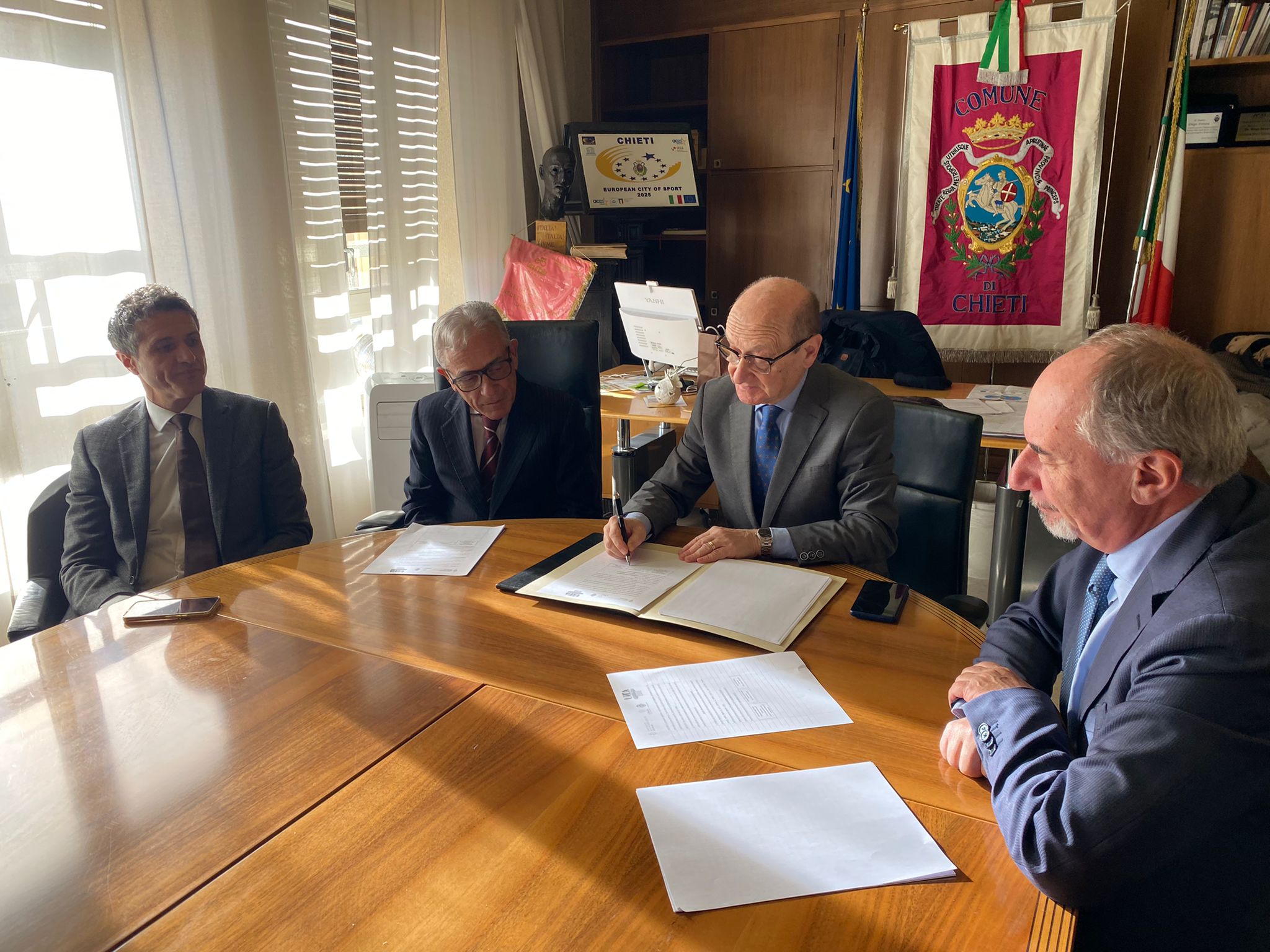 Attorno al tavolo il sindaco Diego Ferrara, il magnifico rettore Ud’A Liborio Stuppia, il presidente della Camera di Commercio Chieti-Pescara Gennaro Strever e il presidente del Consiglio comunale Luigi Febo. L’intento della firma è il rilancio del centro storico del capoluogo teatino. La Camera di Commercio si impegna a mettere a disposizione dell’Ateneo alcuni locali della sede di Chieti Scalo e di Chieti alta.
