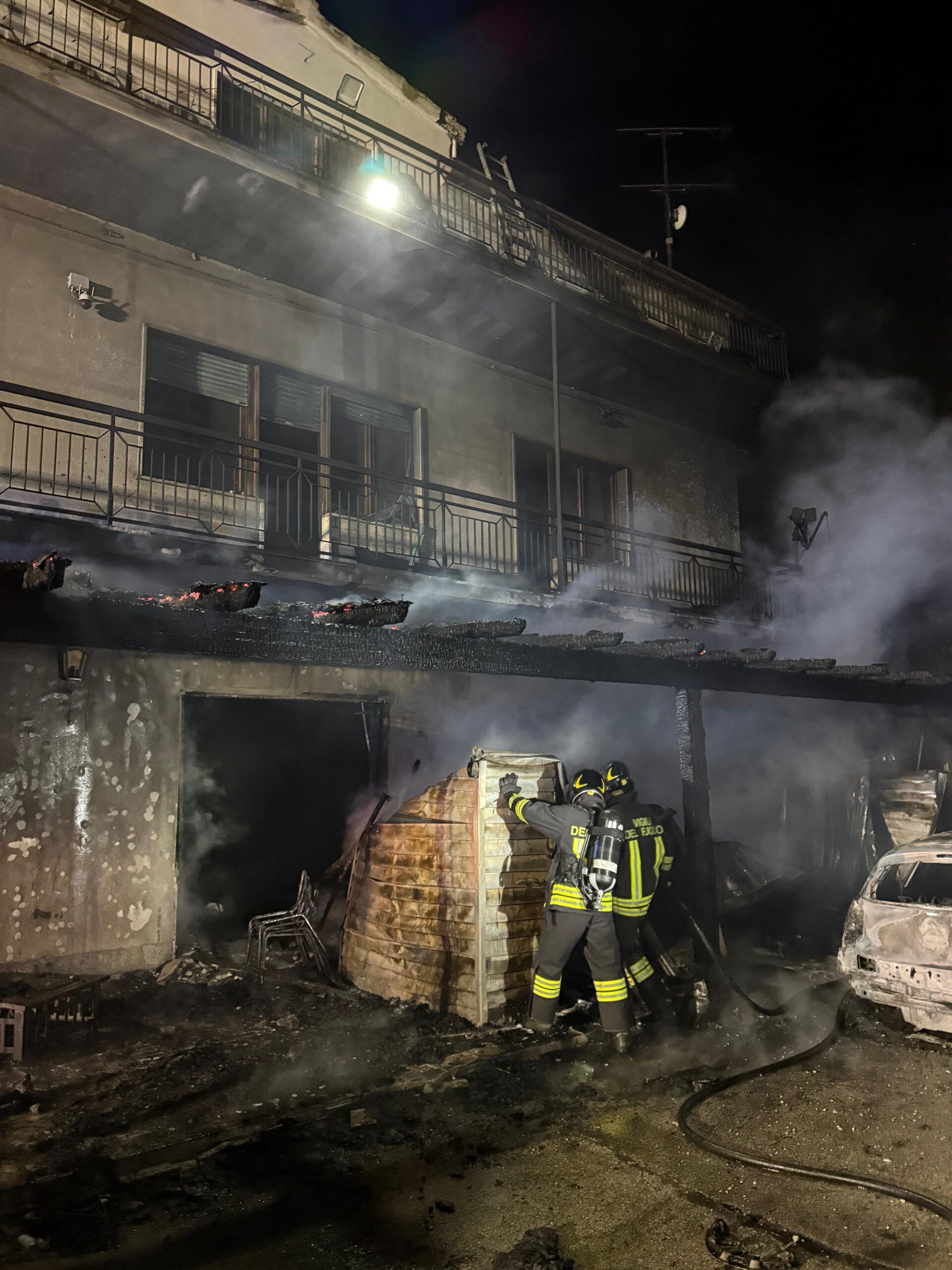 Le fiamme hanno danneggiato quattro auto, una Citroën C3, una Volkswagen UP, una Mercedes GLC e una Dacia Duster, oltre a una tettoia esterna di circa 50 metri quadrati, estendendosi anche al piano terra dell’edificio, adibito a taverna e rimessa. Quattro persone, presenti all’interno dell’edificio evacuato, sono state fatte scendere da un balcone del primo piano attraverso una scala: soccorse, non hanno riportato conseguenze.