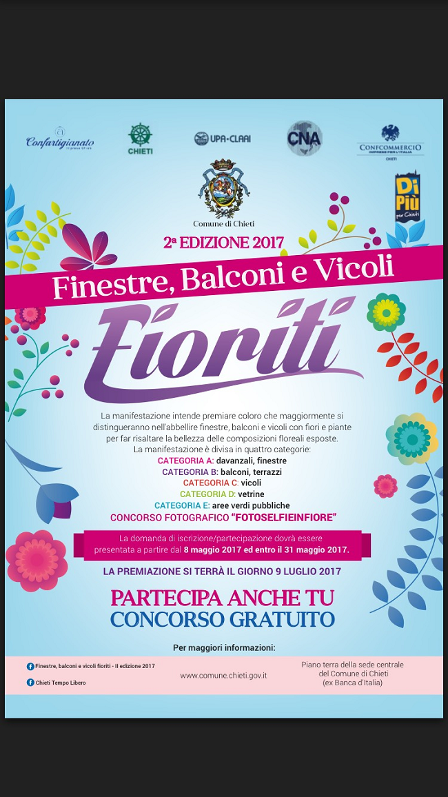 Torna anche quest’anno a Chieti “Finestre, balconi e vicoli fioriti”, seconda edizione del concorso organizzato dall’amministrazione comunale e dalle associazioni di categoria al fine di valorizzare gli aspetti estetici, ambientali e turistici della città.