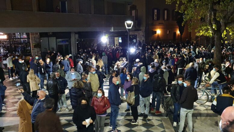 AGGIORNAMENTO ORE 18– Come potete vedere dalle foto, in piazza Muzii a Pescara in tantissimi si sono radunati per la protesta contro l’ultimo DPCM. Commercianti e ristoratori che non sembrano conoscere il timore dei contagia giudicare da quanti sono e soprattutto da quanto sono ammassati. Non mancano le pattuglie della Polizia ma il colpo d’occhio restituisce un evidente zero distanziamento tra i moltissimi ritrovatisi sin dalle 17:30.