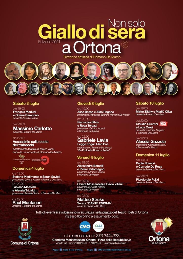 Già dallo scorso anno, con la presenza di autori del calibro di Marcello Fois, Diego De Silva, Valerio Varesi, ma anche con il teatro, i fumetti, la televisione (con la presenza di Francesco Acquaroli intervistato da Tiberio Timperi) l’evento ha aperto le porte alla cultura e all’intrattenimento a trecentosessanta gradi. C’è stato spazio per autori ortonesi non giallisti e anche quest’anno l’attenzione agli artisti locali si concretizzerà con una rappresentazione teatrale dell’associazione Amici del teatro nella serata inaugurale del 3 luglio. In scena la pièce originale Assassinio sulla costa dei trabocchi.
