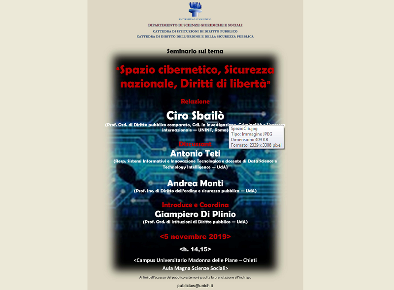 Il 5 novembre 2019 alle ore 14,15 nell’aula magna Scienze sociali del Campus di Chieti della d’Annunzio si svolgerà il seminario ““Spazio cibernetico, Sicurezza nazionale, Diritti di libertà” organizzato dal prof. Giampiero Di Plinio, ordinario di istituzioni di diritto pubblico alla d’Annunzio.