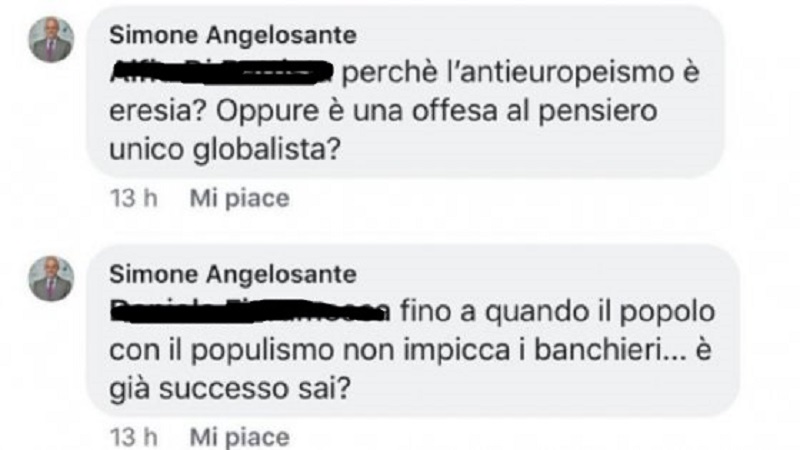 Fino a quando il popolo non impicca i banchieri” e “L’Italia di Conte ha firmato senza autorizzazione del Parlamento sovrano, un trattato che serve alla Germania impegnando l’Italia a versare 125 miliardi che non potrà mai avere indietro. Questo si chiama alto tradimento gli interessi nazionali. In tempo di guerra era punito con la fucilazione alle spalle”. Sono i post ed i commenti riferiti alla tematica del Mes, il cosiddetto “fondo salva Stati”, comparsi sulla pagina Fb del consigliere regionale abruzzese della Lega Simone Angelosante, 55enne ex An, che è anche sindaco di Ovindoli, scatenando una bufera mediatica e politica che ha costretto i vertici salvianiani abruzzesi a prendere in fretta e furia le distanze. Le gravi affermazioni sono contenute in discussioni che si sono sviluppate sulla rete. E’ la seconda volta che esponenti leghisti balzano alle cronache nazionali per uscite discutibili: nei mesi scorsi l’ex coordinatore regionale, il deputato Giuseppe Bellachioma, nel tentativo di difendere l’allora vice premier Salvini aveva minacciato di aspettare i magistrati che accusavano il suo leader. Anche in quella circostanza la dirigenza della Lega era stata costretta a prendere le distanze e il fatto non è passato inosservato visto che anche per quell’episodio nei mesi scorsi Bellachioma è stato sollevato dall’incarico di coordinatore regionale. Angelosante, di professione medico, si era già messo in evidenza per due episodi: l’aver ‘gonfiato’ il proprio curriculum in campagna elettorale per essersi spacciato come direttore sanitario di una clinica privata, e per la polemica con Roberto Vecchioni, colpevole di aver cantato Bella Ciao in un concerto nella sua Ovindoli, dove era già sindaco. “Propaganda di basso livello”, aveva detto il medico. “La Lega Abruzzo prende nettamente le distanze dalle frasi pubblicate sul proprio profilo Facebook dal consigliere regionale Simone Angelosante. Pur confermando i giudizi negativi già espressi in sede parlamentare sul Mes, la Lega non ritiene quelle affermazioni consone a un dibattito che, se pur aspro, deve sempre essere confinato nell’alveo della civiltà e del rispetto”, spiega in una nota il nuovo coordinatore regionale, il deputato Luigi D’Eramo.
