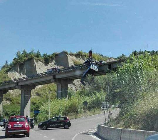 Incidente nella tarda mattinata sulla strada a scorrimento veloce che collega Bucchianico a Guardiagrele. Un tir si è ribaltato sfondando il guardrail divelto per diverse decine di metri su un viadotto all’uscita di una galleria. Come si vede dalle foto postate da Daniele Screpanti sul gruppo Chieti su Facebook, il rimorchio è rimasto in bilico sul viadotto e la motrice si è ribaltata fortunatamente restando sulla carreggiata. Sul posto per i soccorsi un elicottero del 118, e le forze dell’ordine per i rilevi e soprattutto per la messa in sicurezza della zona. Il conducente (P.C., 49 anni di Guardiagrele) è stato trasportato in codice rosso all’Ospedale di Chieti, ma non è in pericolo di vita. Al vaglio dei carabinieri le cause dell’incidente, nel quale non sono stati coinvolti altri veicoli. Intanto, qualche ora più tardi, sulla strada sottostante, come vedete dalle immagini, forse a causa della distrazione per la drammatica visuale sopra il viadotto, un’autovettura si è scontrata con un automezzo per il trasporto dei rifiuti. Il conducente è rimasto imprigionato tra le lamiere per diverso tempo, ma non dovrebbe correre pericolo di vita