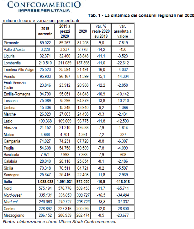 “Nessuna regione è stata risparmiata dalle conseguenze del Covid-19. Nell’anno in corso in Italia perderemo oltre 116 miliardi di consumi e circa 9.5 punti di PIL”, spiega il Presidente di Confcommercio Abruzzo, Roberto Donatelli.