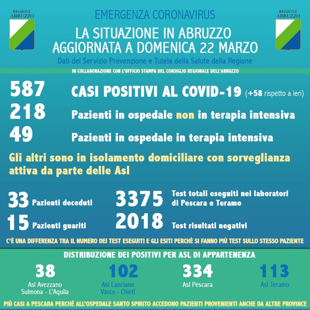 In Abruzzo, dall’inizio dell’emergenza, sono stati registrati 587 casi positivi al Covid 19, diagnosticati dai test eseguiti nel laboratorio di riferimento regionale di Pescara, anche attraverso l’Istituto Zooprofilattico di Teramo. Rispetto a ieri si registra un aumento di 58 nuovi casi.