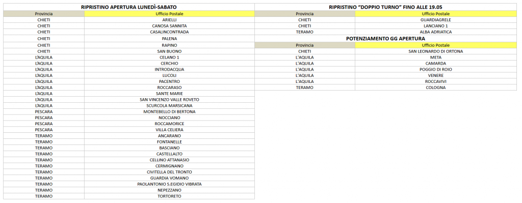 A partire da giovedì 14 maggio, altri 30 uffici postali abruzzesi che avevano temporaneamente rimodulato i giorni di apertura al pubblico, saranno di nuovo operativi tutti i giorni dal lunedì al sabato. Sono 6 nella provincia di Chieti, 9 nella provincia dell’Aquila, 4 nella provincia di Pescara e 11 nella provincia di Teramo