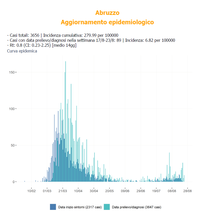 Il report nazionale dell’ISS sul Covid 19 nelle regioni. Nell’ultima settimana l’indice di Rt in Abruzzo è sceso sotto la soglia di 1. In Italia “Aumentano i casi. Potenziata la capacità di screening, ma occorre rispettare misure di precauzione”, secondo gli scienziati.