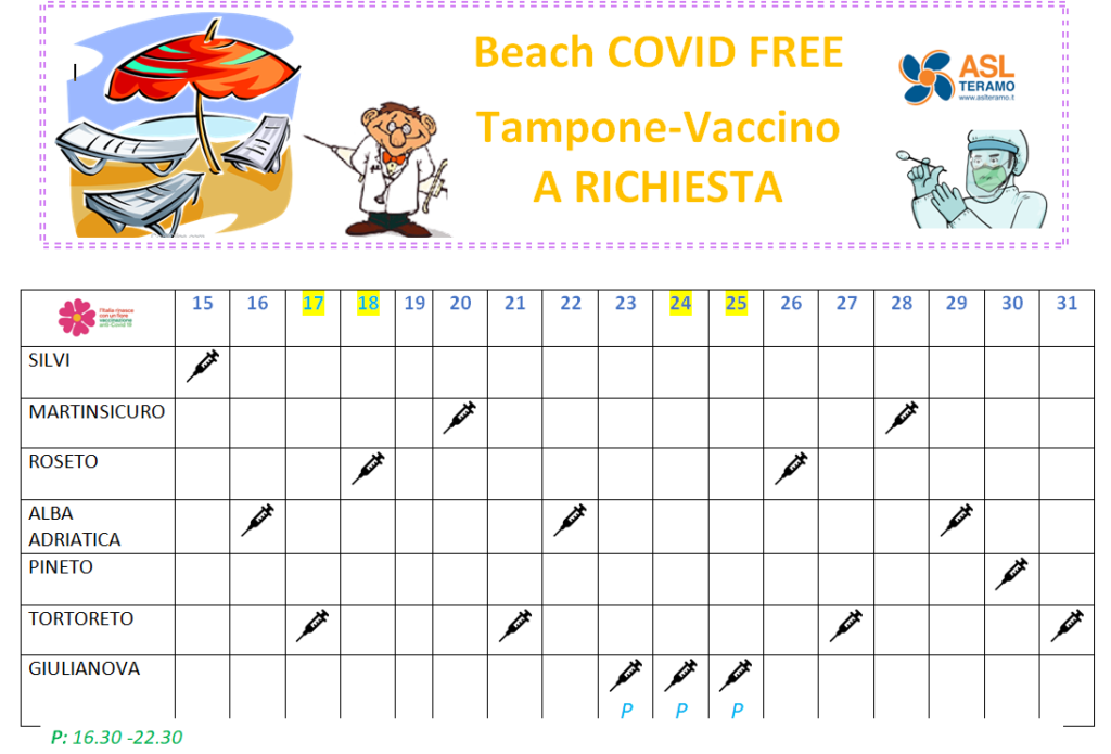 Nel frattempo per contrastare al massimo la diffusione del virus prosegue la campagna “Beach Covid-free” ideata dalla Asl di Teramo e che da la possibilità grazie a un camper che si sposterà lungo la costa della provincia, di effettuare sia il tampone sia il vaccino anche e soprattutto a beneficio dei turisti.