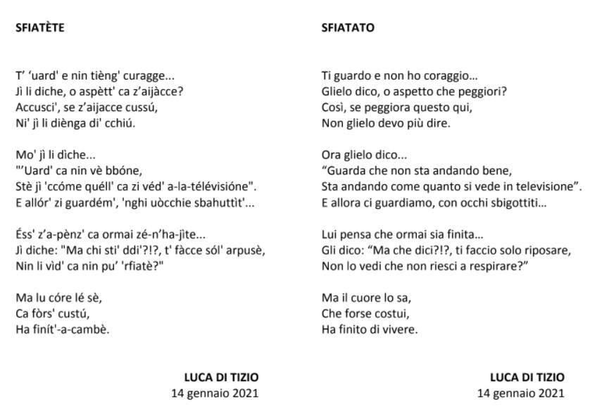 “Il dialetto è uno strumento potentissimo per dar voce a quello che sente il cuore, nella maniera più spontanea e vera possibile – dichiara il dott. Di Tizio. Questo componimento nasce così, per fare uscire fuori le emozioni più intense e forti che, da un anno a questa parte, il mio cuore, come quello di molti altri medici e infermieri, è chiamato a provare quotidianamente. La poesia descrive un particolare momento della nostra attività, quando noi rianimatori siamo chiamati in ospedale ad intubare pazienti, affetti da questa terribile polmonite. E così devi tranquillizzare, dare parole di conforto e speranza. Nel tuo cuore però – conclude Di Tizio – c’è tristezza e preoccupazione. E allora il distacco iniziale viene meno. Il malato non è più soltanto la persona che deve beneficiare della tua professionalità, ma diventa l’uomo, solo, impotente e spaventato di fronte a questa terribile pandemia”.