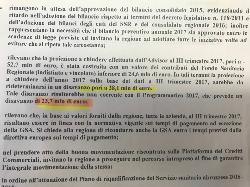 “100 milioni? sono le loro balle elettorali e le fake news”. E’ questo il commento postato su Facebook dall’assessore regionale alla Sanità Silvio Paolucci, per chiudere la polemica riguardante il disavanzo dei conti della sanità abruzzese. “Lo scostamento” -aggiunge Paolucci e si legge nello stralcio del verbale pubblicato nel post- è di 4,4 mln su 2450 milioni circa. Migliorano ancora i dati relativi all’offerta di assistenza. Chiedano scusa per le scorrettezze dette ai cittadini”, conclude l’assessore che ha potuto leggere in questi giorni il verbale della più recente riunione con i funzionari ministeriali, cui Paolucci non aveva potuto presenziare personalmente per urgenti motivi di famiglia, e all’indomani del quale vennero diffuse quelle cifre sullo scostamento dei conti della sanità regionale.
