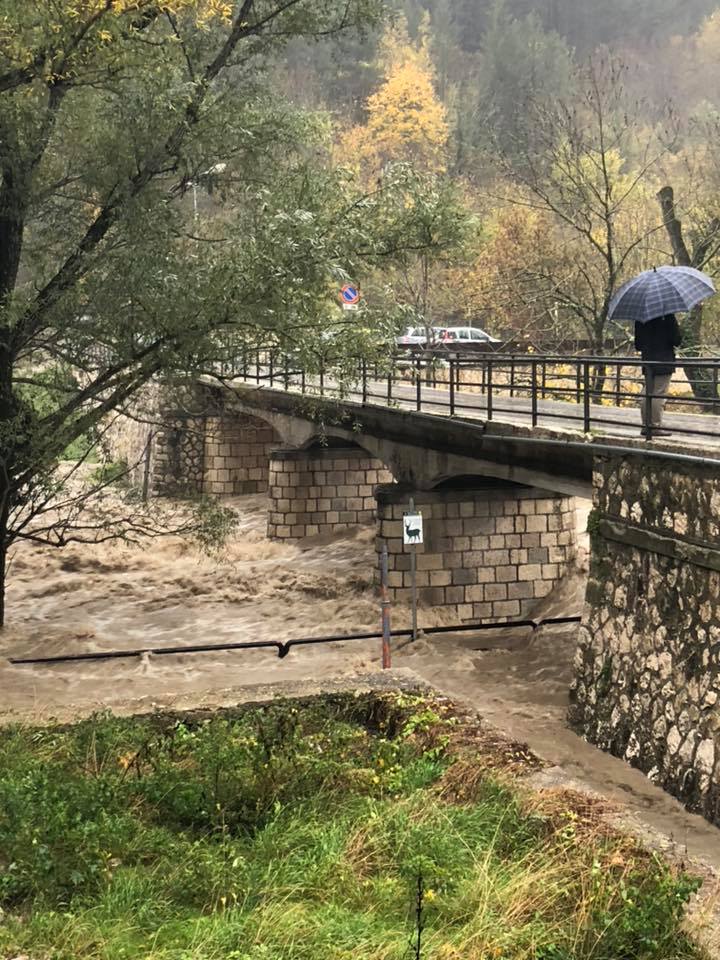 Esondazione del fiume Sangro a Villetta Barrea, crolla ponte pedonale. Forti piogge nell’Abruzzo interno. Per la regione l’allerta diventa rosso.