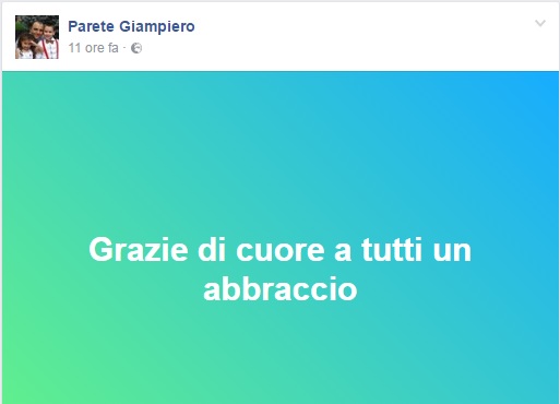 Ore 10,30 – Giampiero Parete ringrazia su Facebook “Grazie di cuore a tutti, un abbraccio”. Così Giampiero Parete ha risposto su Fb alle centinaia di messaggi di conoscenti e amici ma anche di sconosciuti che continuano ad arrivare sul suo profilo Fb dopo che i soccorritori sono riusciti a salvare lui, sua moglie e i due figli dalle macerie dell’hotel Rigopiano.