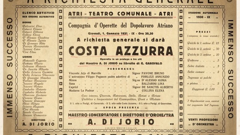 Era il 1881 quando, dopo 9 anni di lavori, fu inaugurato il Teatro Comunale di Atri con la messa in scena di “Un ballo in maschera” di Giuseppe Verdi. Per celebrare 140 anni di storia il Comune, in collaborazione con l’Archivio Di Jorio, ha organizzato uno spettacolo senza pubblico per il 25 aprile alle 15.