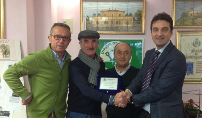 Dino Carletti, montesilvanese in forza al Gs Moscufo, è uno dei più noti cicloamatori abruzzesi. Nella sua categoria aveva vinto, l’anno scorso, il “Mundialito Open” di Morro d’Oro (nella foto la targa ritirata al Comune di Montesilvano)