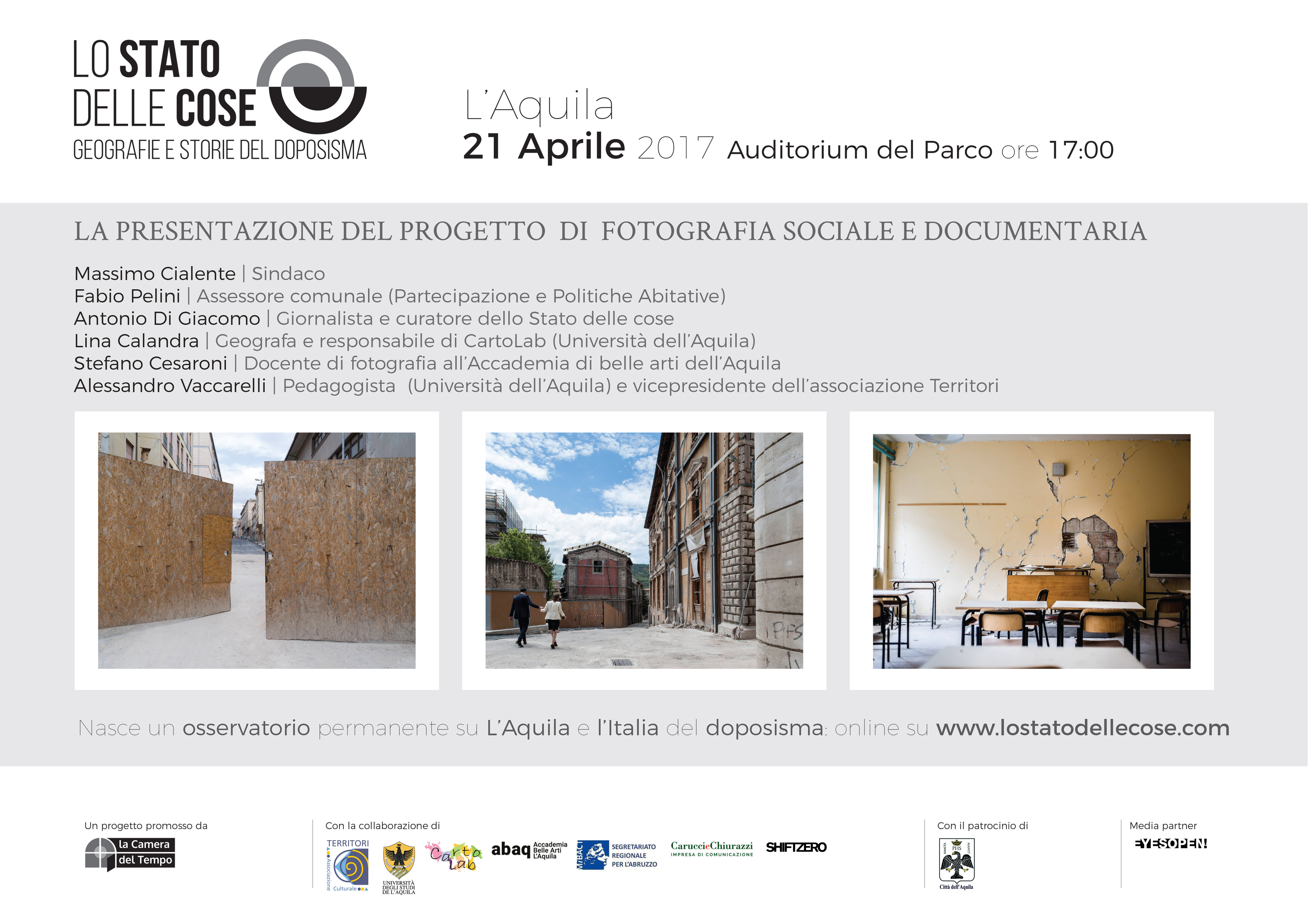 “Lo stato delle cose” sarà presentato domani alle ore 11 a palazzo Fibbioni. Oltre 200 fotogallery e più di 10mila immagini serviranno a raccontare L’Aquila oggi e l’Italia del doposisma: scatti fotografici che documenteranno i paesi in abbandono dopo il terremoto del 1980 dall’Irpinia ad Amatrice. Si tratta del più grande osservatorio fotografico online sugli effetti dei terremoti in Italia e si avvale del lavoro di 60 fotografi italiani che hanno preso parte al progetto non profit di fotografia sociale e documentaria intitolato “Lo stato delle cose. Geografie e storie del doposisma”.
