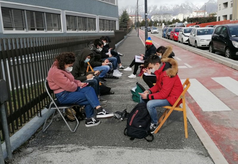 Un gruppo di studenti dell’ultimo anno del Liceo Scientifico ‘Pollione’ di Avezzano in Dad davanti all’istituto per esprimere il dissenso nei confronti del nuovo provvedimento che riporta per l’ennesima volta le lezioni da in presenza, seppure al 50%, in DAD.