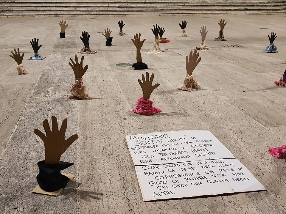 “Dopo Atri, anche Pescara si ri-sveglia con l’installazione artistica “mani” che annegano. Per ricordare al ministro dell’interno, che sfilerà oggi in città, che le vite delle persone ci stanno a cuore e vogliamo che più nessuno muoia in mare.”