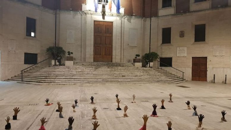 Posizionate nella notte davanti al Comune di Pescara le mani della installazione #arteresistente. Nel pomeriggio si svolgerà nel palazzo la conferenza stampa di Salvini con Berlusconi e Meloni.