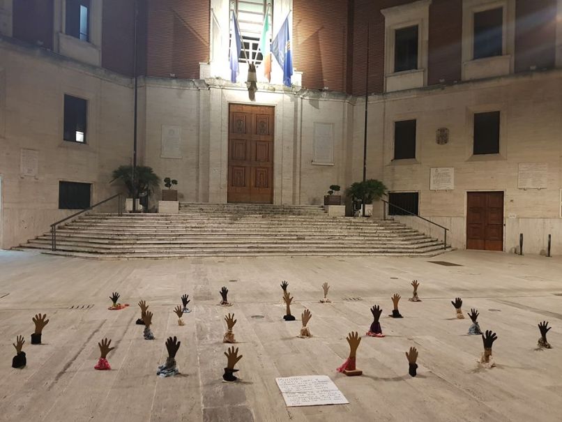 Posizionate nella notte davanti al Comune di Pescara le mani della installazione #arteresistente. Nel pomeriggio si svolgerà nel palazzo la conferenza stampa di Salvini con Berlusconi e Meloni.