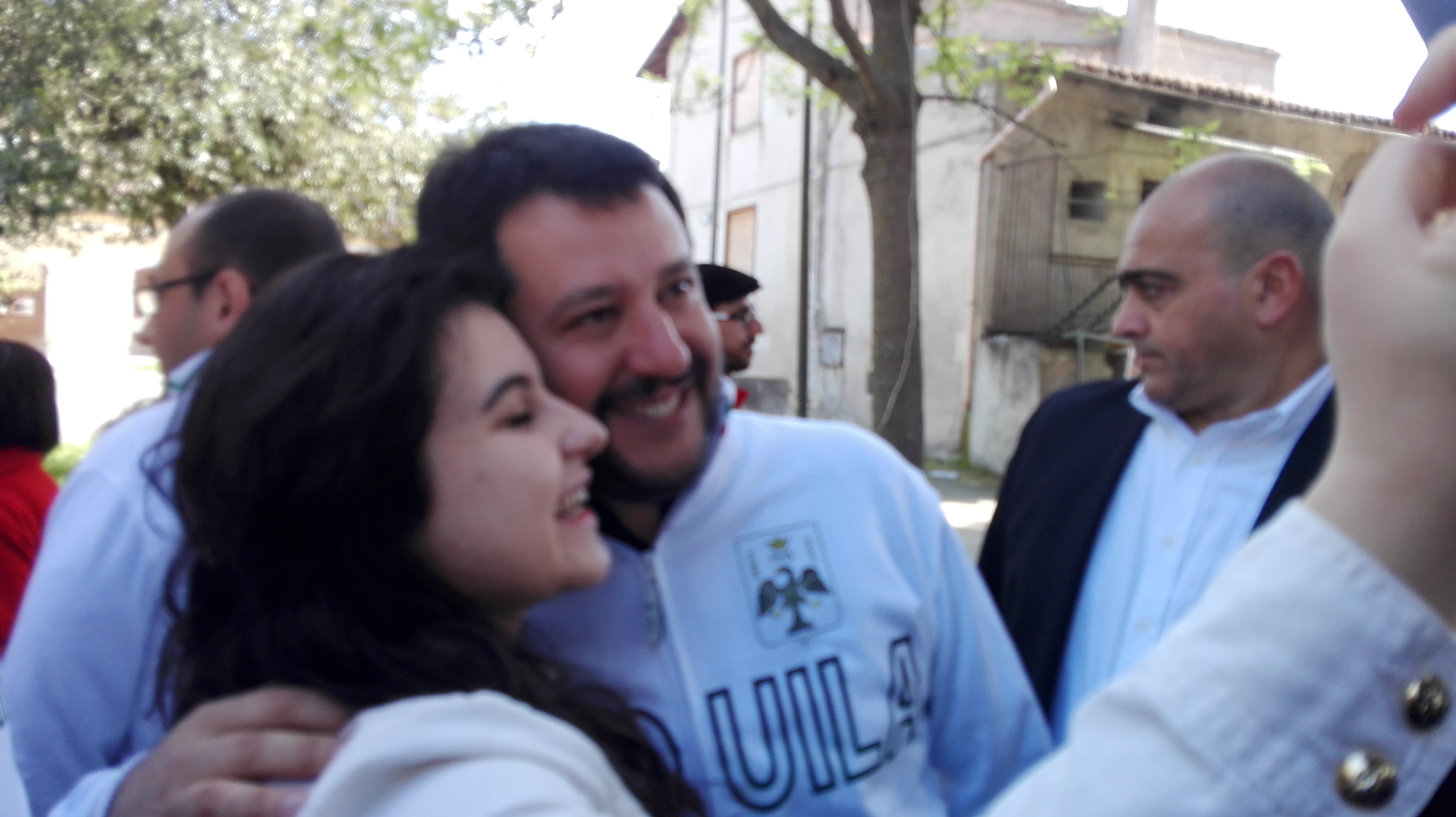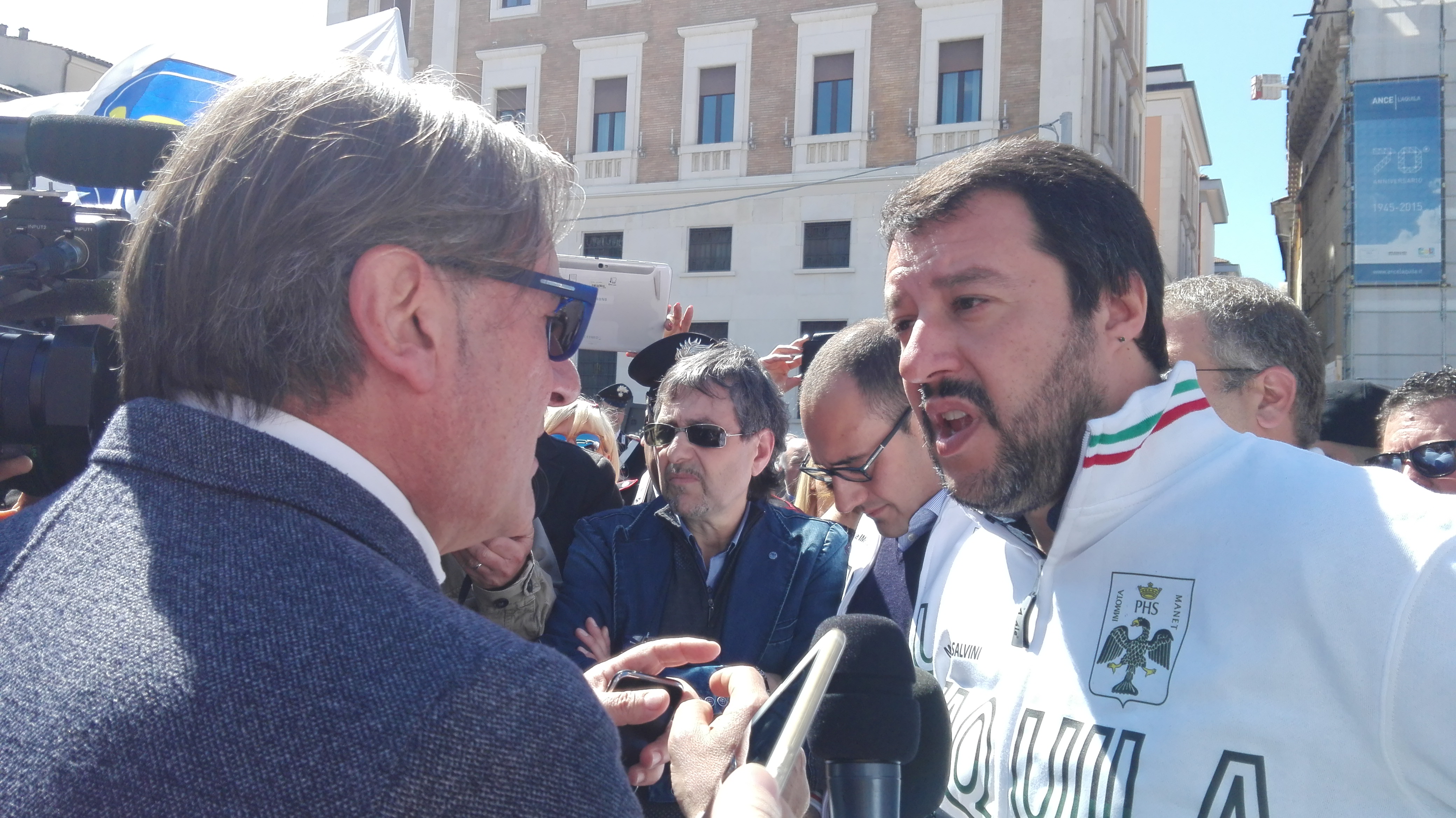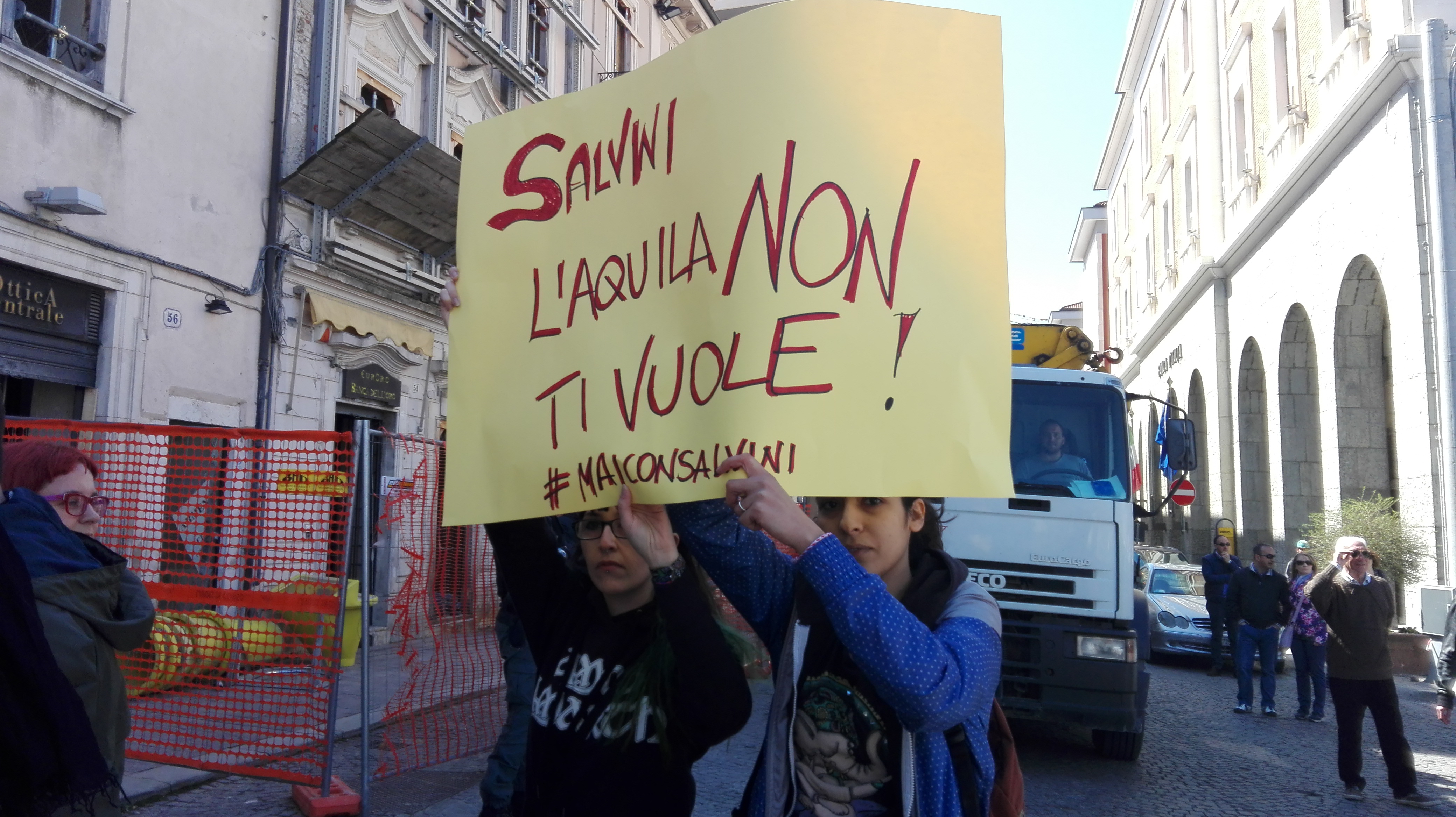 LA CONTESTAZIONE – Un gruppo di giovani, ha contestato Salvini, di fronte a palazzo Fibbioni, nel cuore del centro storico, esponendo tra l’altro un cartello con la scritta “Salvini, L’Aquila non ti vuole”, firmato #maiconsalvini. Dirigendosi verso la sede del Comune il leader della Lega inviava baci ai contestatori, come pure i suoi accompagnatori. A quel punto dalla folla è partito il grido “sciacallo!”, gli accompagnatori di Salvini hanno applaudito.