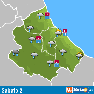 Nel teramano : deboli rovesci o piogge. I venti saranno prevalentemente deboli e soffieranno da Sud con intensità di 9 km/h. Possibili raffiche fino a 31 km/h. Temperature minime comprese tra 0 e 3 °C e massime comprese tra 7 e 10 °C. Zero termico a 2000 metri.