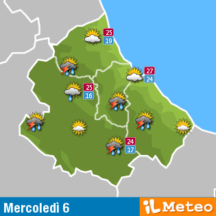 Teramo: nuvoloso con piogge deboli al mattino (23-26°); nuvoloso con temporale nel pomeriggio (27-25°); nuvoloso in serata e in nottata.
