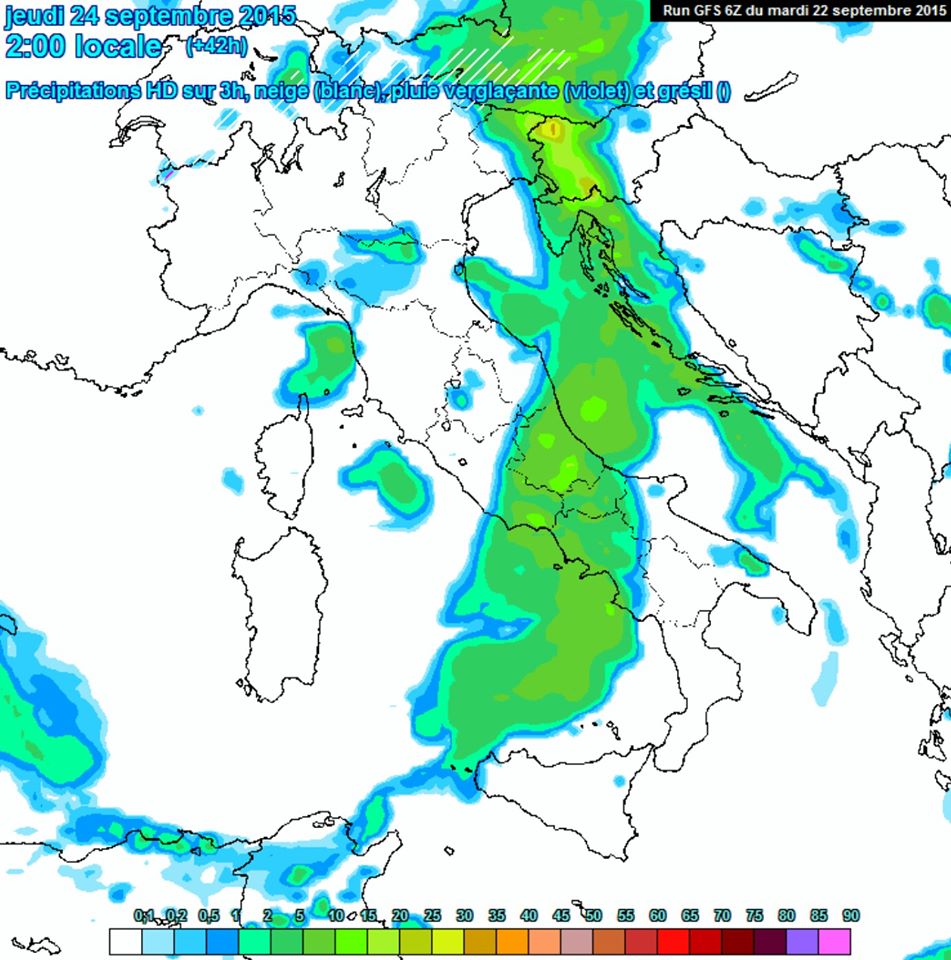 La perturbazione atlantica oggi, mercoledì 23 settembre, raggiungerà nel pomeriggio anche le zone centrali della penisola. Per Giovanni De Palma di Abruzzometeo il peggioramento “prevarrà a partire dal pomeriggio di mercoledì e interesserà l’Abruzzo anche nella prima parte della giornata di giovedì (vedi diagramma foto). Attesi rovesci e manifestazioni temporalesche, localmente di moderata intensità, in graduale trasferimento dalle zone interne e montuose della regione a quelle orientali e costiere”. Le temperature sono previste in sensibile diminuzione, specie nei valori minimi. I venti tenderanno a provenire dai quadranti meridionali.