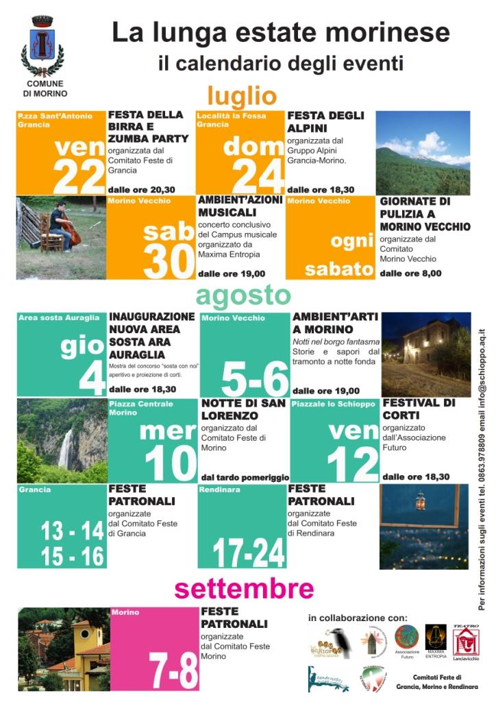 L’estate morinese si chiuderà infine con le tradizionali feste patronali, organizzate dai comitati feste di Grancia dal 13 al 16 agosto, di Rendinara dal 17 al 24 agosto e dal comitato feste di Morino il 7 e 8 settembre.