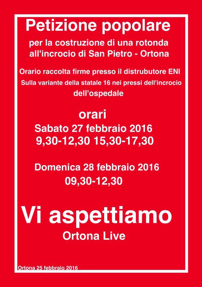 “Adesso” -prosegue Ortona Live- “visto che non abbiamo ottenuto niente, abbiamo deciso di passare all’azione con una raccolta di firme, per sollecitare la costruzione di una rotatoria che riduca al minimo la possibilità di incappare in un malaugurato incidente. La raccolta firme partirà da sabato 27 Febbraio presso il distributore Eni sulla variante della SS 16 nei pressi dell’incrocio dell’ospedale e proseguirà anche domenica mattina sempre nel piazzale del distributore”.