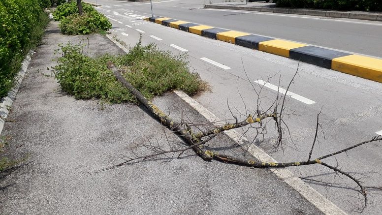 Protesta dei residenti di via Aldo Moro a Pescara per il degrado in cui versa la strada cittadina: un albero caduto sul marciapiedi ha invaso anche la pista ciclabile.