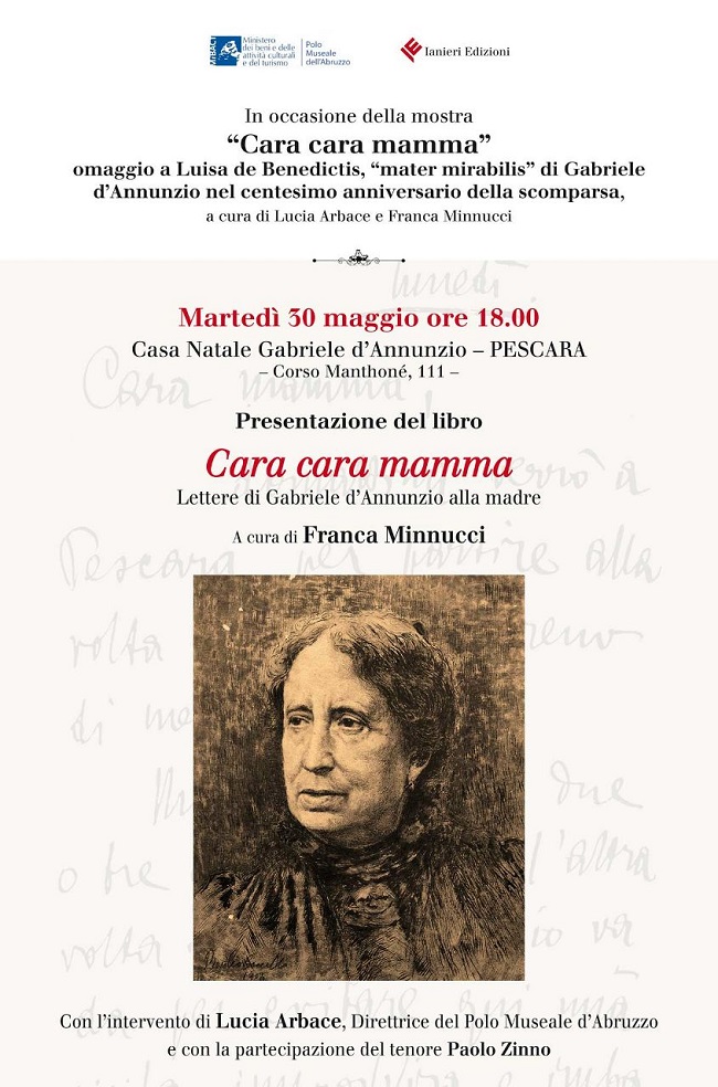 La nuova opera letteraria dell’attrice Franca Minnucci, grande studiosa del Vate, sarà presentata al pubblico martedì 30 maggio alle ore 18 presso la casa natale di Gabriele d’Annunzio a Pescara in corso Manthoné, in occasione dell’allestimento della mostra “Cara cara mamma” in omaggio alla “mater mirabilis” del letterato abruzzese nel centesimo anniversario della scomparsa.