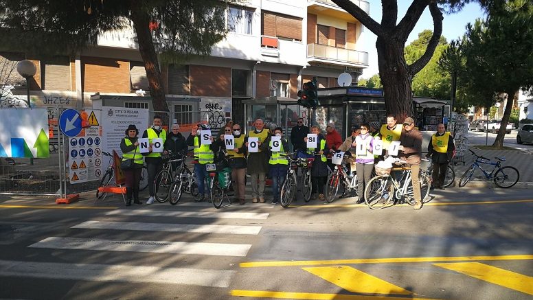 A Pescara ciclisti e ambientalisti organizzano un flash mob in via Leopoldo Muzii per sostenere il progetto della pista ciclabile. Il cantiere è partito tra le proteste di commercianti e residenti.