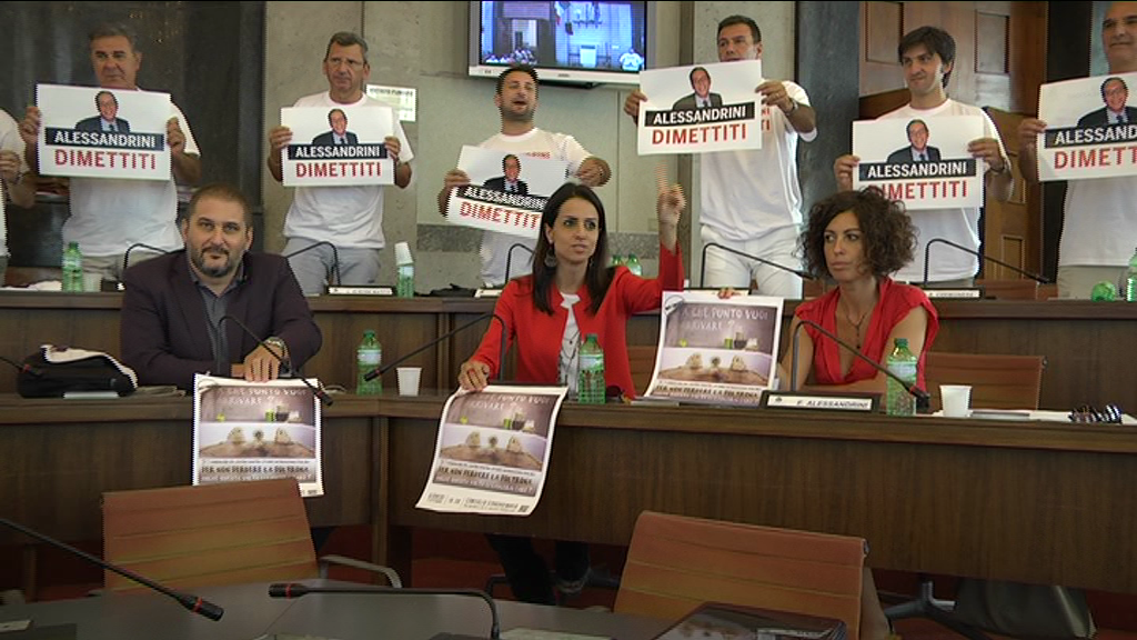 I lavori sono iniziati alle 17; in aula sono presenti 24 consiglieri e dunque la seduta è valida. Ci sono anche tanti cittadini e rappresentanti di associazioni. I consiglieri comunali di centrodestra hanno indossato delle T-shirt con la scritta “Alessandrini dimettiti”; sono stati richiamati dal presidente del Consiglio Comunale, Antonio Blasioli, a tenere un comportamento “più urbano e rispettoso dell’istituzione e a sfilare la maglietta. La replica del capogruppo di Forza Italia, Marcello Antonelli, è stata questa: “Presidente chiami i marines e ne chiami tanti perché noi la maglietta non ce la togliamo”. A questo punto la seduta è stata sospesa per un’ora.