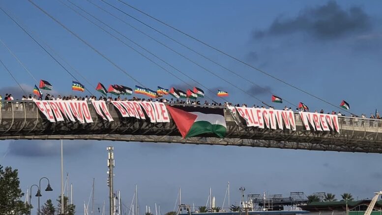 Dopo il raduno dei manifestanti alle 18 si è formata una catena umana che ha percorso il Ponte del Mare al grido di “Palestina libera”.
