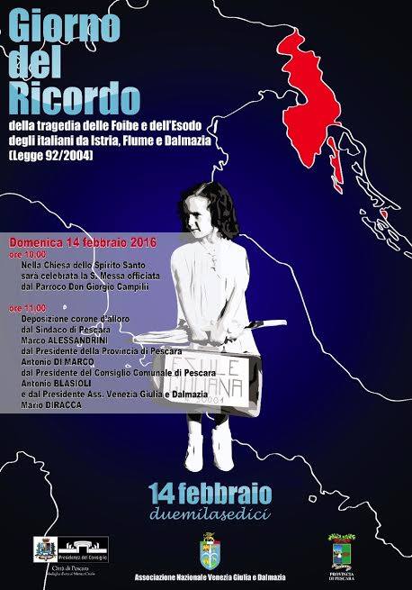 Pescara: domenica 14 febbraio alle ore 10 si terrà una messa di suffragio per le vittime delle foibe preso la chiesa dello Spirito Santo; a seguire deposizione di una corona al monumento nella vicina piazza Giuliano-Dalmati.