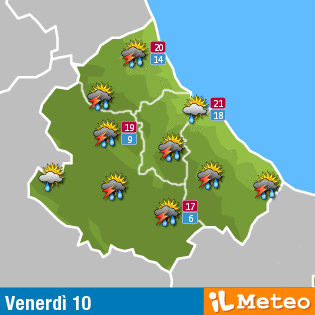In provincia di Chieti temporali e schiarite, con le minime a 14 °C e le massime a 25 °C. Probabilità di pioggia al 70%. Venti deboli da Sud-Sudest