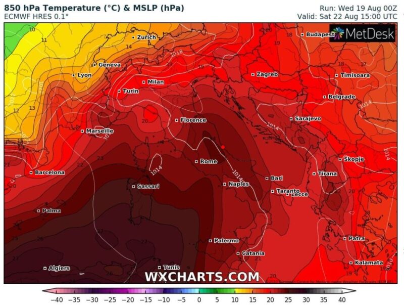 Si assiste alla rimonta di un promontorio di alta pressione di matrice nord africana che, a partire da oggi, giovedì, si estenderà verso la Sardegna e, successivamente, verso le nostre regioni centro-meridionali, favorendo condizioni di tempo stabile ma con temperature in generale aumento. In particolare, alla base dei dati attuali, la giornata più calda sarà sabato, quando i valori termici previsti a 1500 mt circa, ci mostrano punte di ben +24°C sulle zone interne della nostra regione. Una situazione, questa, che porterà caldo e afa lungo le coste e temperature elevate nell’Aquilano, sulla Marsica, sulla Valle Peligna e sulle zone collinari che si affacciano sul versante adriatico, nonché in Val Pescara e in Val di Sangro, con punte massime che, occasionalmente potrebbero raggiungere e localmente superare anche i +36°C/+39°C. Temperature meno elevate attese lungo le aree costiere e sulle zone collinari prossime alla costa dove, tuttavia, assisteremo ad un deciso aumento dei tassi di umidità e temperature piuttosto elevate anche durante le ore serali, notturne e al primo mattino. Quando finirà? Alla luce dei dati attuali, da domenica inizieremo ad assistere al cedimento dell’alta pressione al nord, poi anche al centro nella giornata di lunedì, e non si esclude un aumento dell’instabilità al centro-nord. Si tratta, quest’ultima, di una tendenza da analizzare ed eventualmente confermare nei prossimi aggiornamenti.
