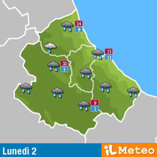 A Teramo piogge diffuse, anche rovesci a carattere temporalesco. Temperature dagli 9° ai 15 °C. Venti moderati da Nord. Previste precipitazioni temporalesche anche nel sub-appennino teramano, con vento da Nord e raffiche fino a 30 km/h.