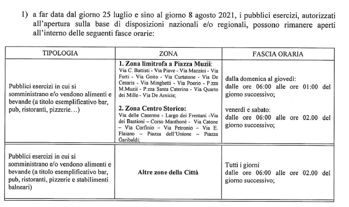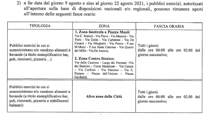 L’Ordinanza distingue, almeno fino all’8 agosto compreso, tra due zone del territorio cittadino, quella della “movida” (che nei giorni feriali anticiperà la chiusura all’una di notte) e tutto il resto della città dove si chiude alle 2.