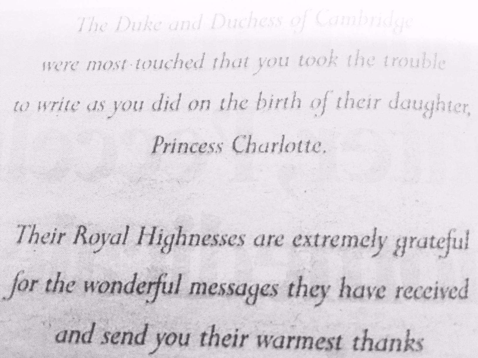 “Il duca e la duchessa di Cambridge sono stati molto commossi che vi siate prodigati nello scrivere per la nascita della loro figlia, la Principessa Charlotte. Le loro Maestà vi sono estremamente grate per i meravigliosi messaggi che hanno ricevuto e vi mandano i più sentiti ringraziamenti e i loro migliori auguri”.