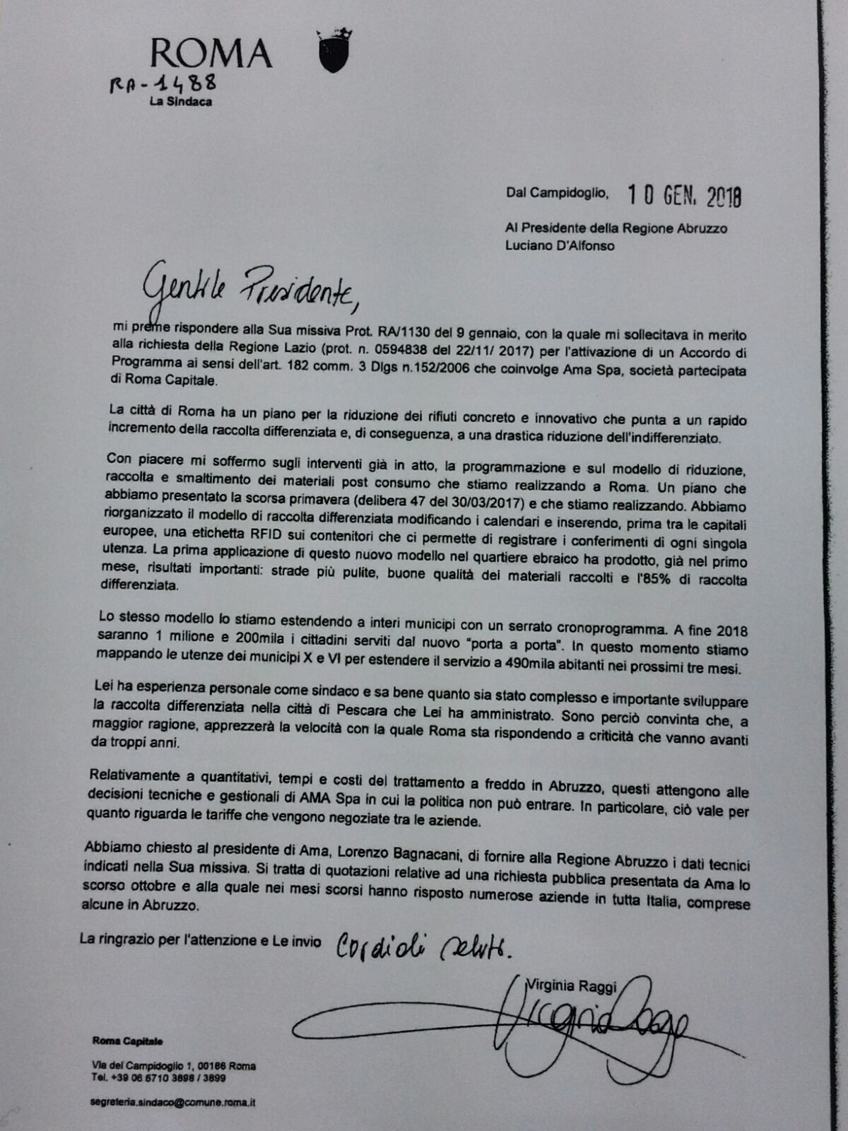 Virginia Raggi, sindaco del Comune di Roma, risponde con una lettera ai quesiti posti dal governatore D’Alfonso circa la questione dei rifiuti della capitale che potrebbero essere trattati in Abruzzo negli impianti di Aielli, Sulmona e Chieti.