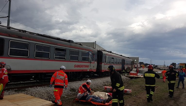 La simulazione dell’incidente ferroviario è avvenuta alle ore 9:10 circa con la collisione tra il convoglio passeggeri, con a bordo circa 80 figuranti, e la ferrocisterna. Lo scontro è stato accompagnato sia con effetto visivo che sonoro, riproducendo l’impatto e l’incendio a seguito dell’urto.