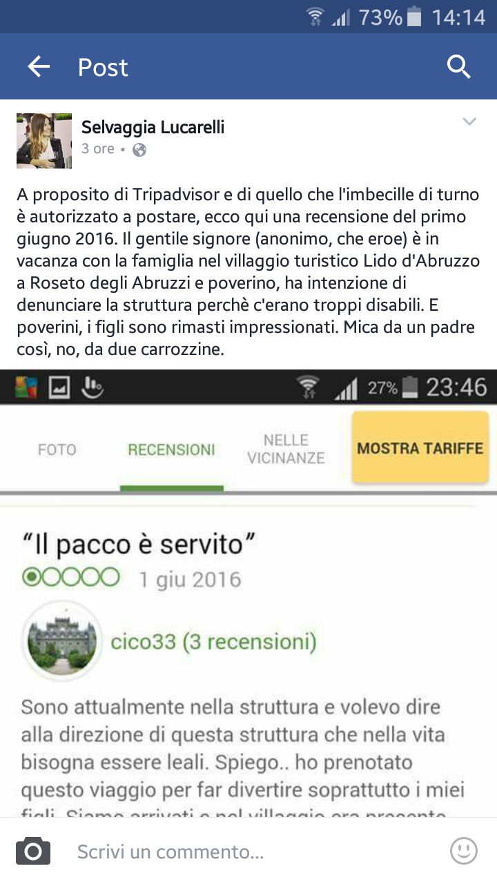 Sul caso è intervenuta anche Selvaggia Lucarelli, commentando la recensione del turista: “Il gentile signore è in vacanza con la famiglia a Roseto degli Abruzzi e, poverino, ha intenzione di denunciare la struttura perché c’erano troppi disabili. E poverini, i figli sono rimasti impressionati. Mica da un padre così, no, da due carrozzine”.