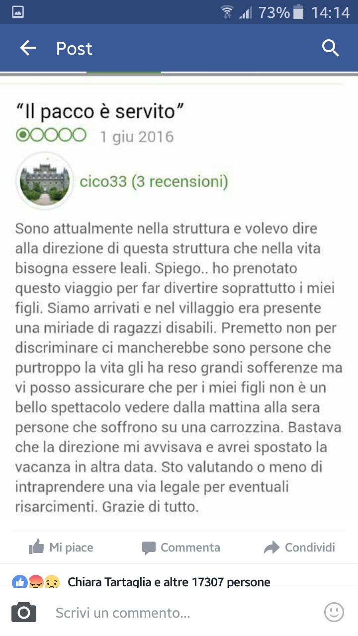 Tutto è partito da una recensione sul villaggio “Lido d’Abruzzo”, pubblicata dal turista in questione su Tripadvisor: l’uomo, infastidito dalla convivenza nella stessa struttura alberghiera con alcuni disabili in carrozzina, pensa di intentare una causa legale per un possibile risarcimento a scapito dei proprietari dell’albergo, “colpevoli” evidentemente, di non aver avvisato l’uomo della presenza di persone in carrozzina.