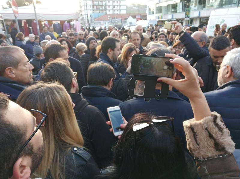 LA CONTESTAZIONE – Bella ciao e ‘no odio’, a Pescara non solo selfie per Salvini, Presidente Consiglio intona ‘scemo’ per smorzare l’inno. Una decina di contestatori ha manifestato contro Matteo Salvini, a Pescara tra le vie dello storico mercato di Portanuova. In particolare, un gruppo di ragazzi ha urlato “basta con la politica dell’odio” e poi ha intonato ‘Bella ciao’, subito smorzata dalle urla dei sostenitori della Lega. Il presidente del Consiglio comunale, Marcello Antonelli, e altre persone hanno urlato in coro “scemo, scemo” contro i ragazzi. Il tutto è avvenuto sotto il controllo delle forze dell’ordine: imponente il servizio di sicurezza, con decine di uomini presenti. Un centinaio i sostenitori di Salvini, ma è difficile fare una stima a causa delle tante persone presenti per il mercato. Poco dopo un altro gruppetto di persone ha seguito Salvini nella sua passeggiata tra le bancarelle, riproducendo in loop ‘Bella ciao’ con una cassa bluetooth.